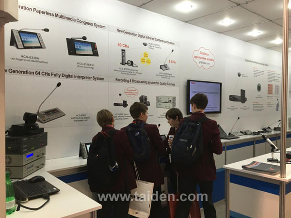 | During the 4-day event, numbers of visitors were attracted to TAIDEN’s stand, including education workers, integrators, resellers, distributors, students, etc. As a leading brand for conference system, TAIDEN has already been known by the world. However, digital infrared is still a quite new technology for education industry. After listening to the introductions of products showcased, visitors all showed great interest and highly praised the practical and efficient functions and the CD like perfect sound performance. Compared to common solutions, which cannot solve the problems of interference between classrooms, TAIDEN TES-5600’s feature of high interference resistance impressed visitors the most. |